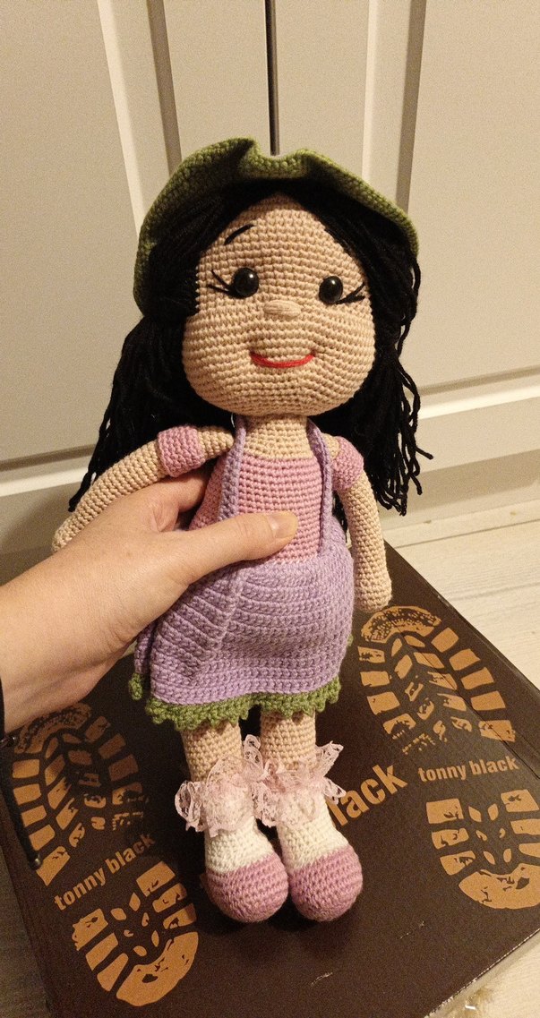 Siyah saçlı, yeşil şapkalı, pastel mor renkte el örgüsü amigurumi bebek. Çocuğunuz için en iyisi en sağlıklısı doğal el örgüsü bebek. #amigurumi #bebek #oyuncak #mor #saçlıbebek #organikoyuncak