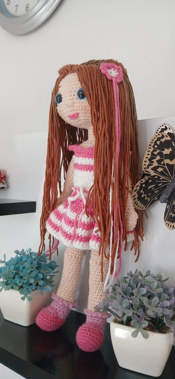 Uzun kahverengi saçlı,çiçek tokalı, mavi gözlü, pembe beyaz çizgili elbiseli renkli örgü bebek.boncuk silikon ile doldurulmuş,kilitli göz kullanılmıştır,elbisesi çıkartılabilir,kargoya hazırdır,istenilen renklerde sipariş alınır