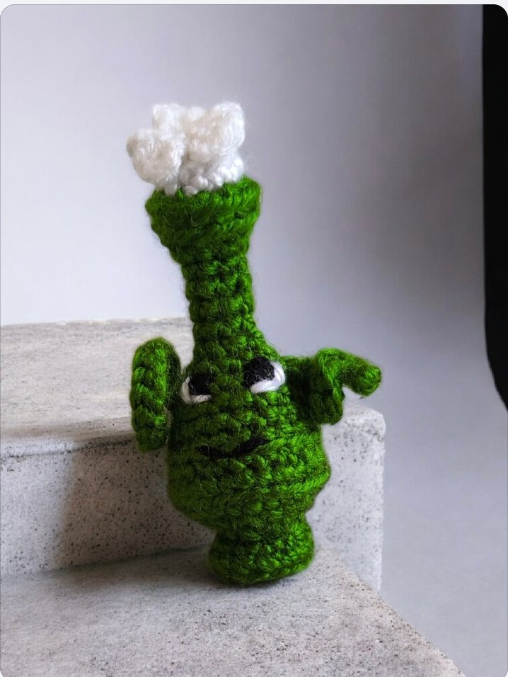 Yeşil el örgüsü amigurumi uzaylı oyuncak, üst kısmında beyaz detaylar ve sevimli gözlerle yumuşak ve eğlenceli bir tasarıma sahiptir. yükseklik 8cm
