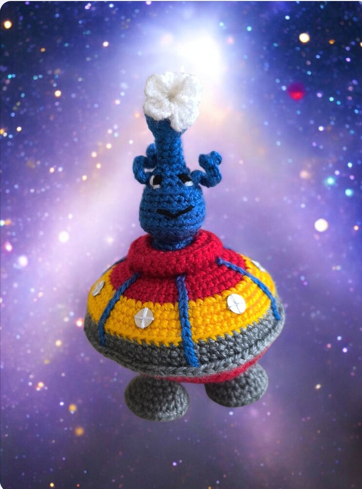amigurumi örgü uzaylı ve uzay gemisi oyuncak, antenli mavi bir uzaylı ve çok renkli UFO şeklinde bir gövdeye sahiptir. Uzay gemisi yükseklik 9 çap 10 cm, uzaylı yükseklik 8cm, ikili fiyatıdır