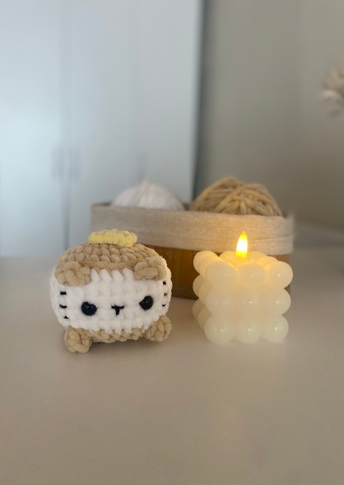 Tepesindeki tereyağı detayıyla sevimli Pancake oyuncak, sevimli yüzü ve küçük detaylarıyla dekorasyon veya hediye için uygundur. Pancake cat