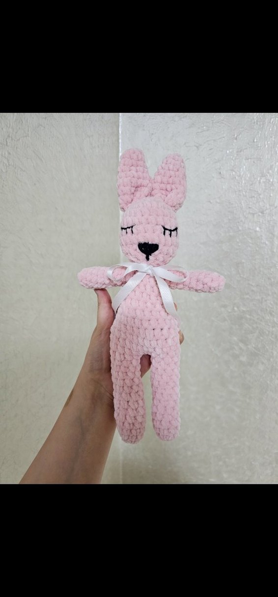 Yumuşak dokulu, pembe peluş tavşan oyuncak. Gözleri kapalı ve boynunda beyaz kurdele var. Pastel renkte.
