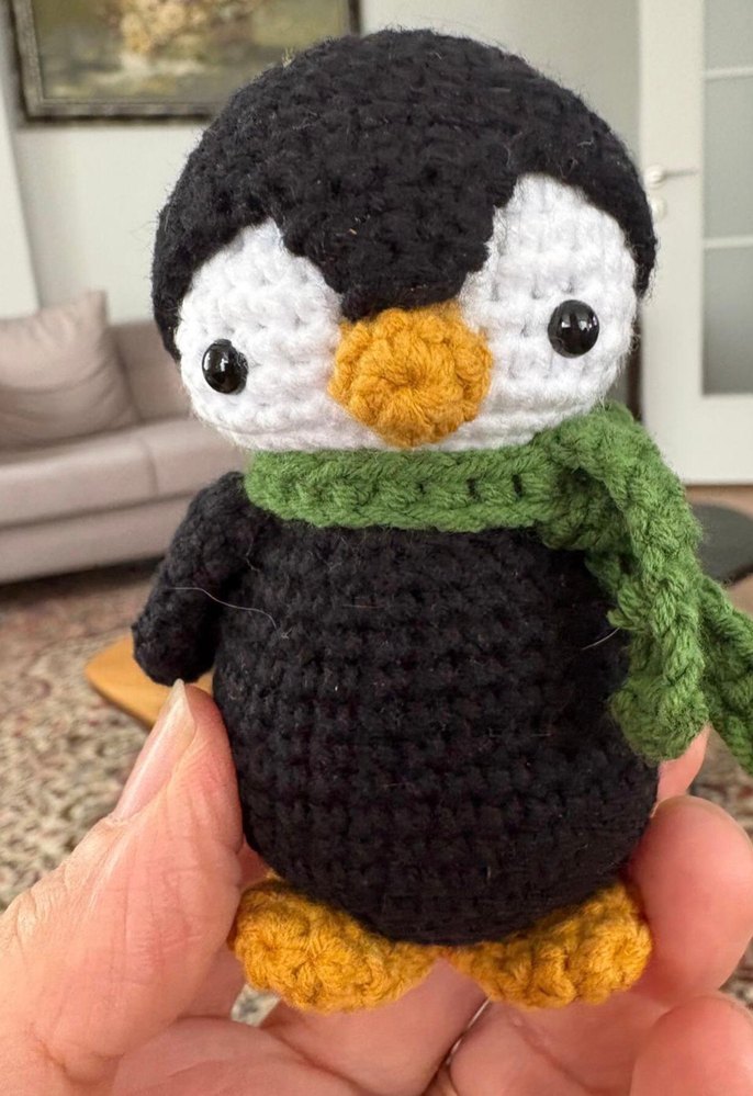 El örgüsü gri penguen peluş oyuncak, siyah gözler, turuncu gagası ve ayaklarıyla birlikte yeşil atkı takıyor. Yumuşak ve sevimli.