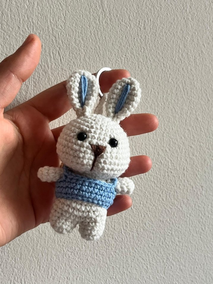 Beyaz ve mavi süveterli, yumuşak tığ işi dokusuna sahip renkli el yapımı tavşan anahtarlık.