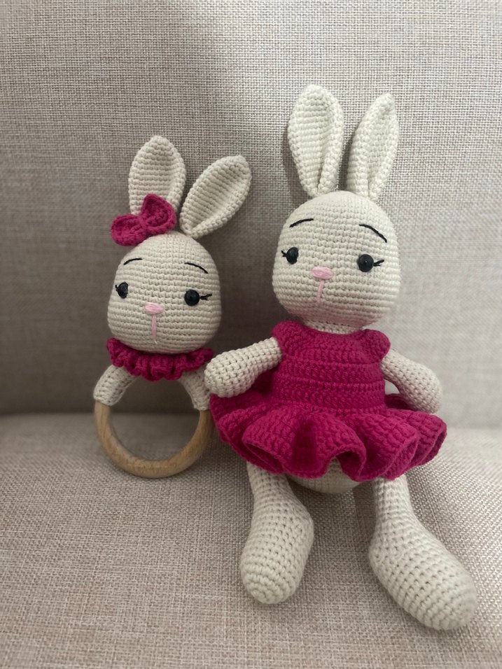 Pembe örgü tavşan diş kaşıyıcı ve oyuncak, halka saplı ve elbise giymiş. Bebeklerin güvenle çiğneyip sarılabileceği ürün. Seti istenilen renkte örebilirim.