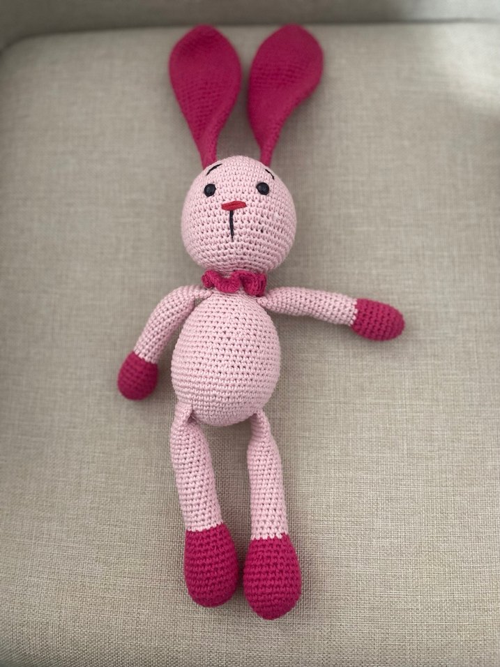 Pembe peluş oyuncak, uzun kulaklı ve koyu pembe detaylı el örgüsü tavşandır. İstenilen renkte örebilirim. Organik ip kullanıyorum. Makinede yıkanabilir. Bebekler için harika bir arkadaş.
