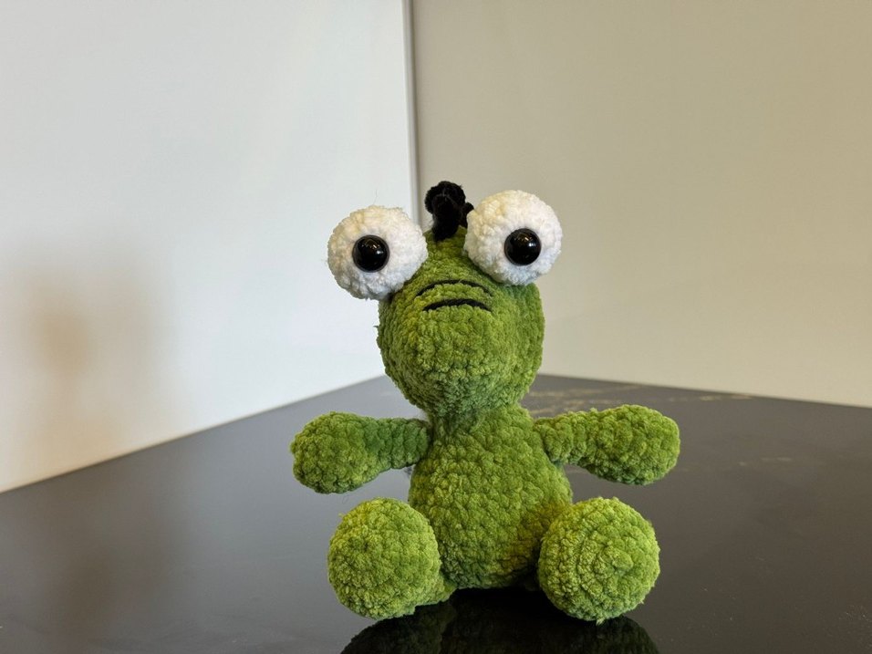Büyük beyaz gözlere sahip yeşil peluş oyuncak kurbağa, yumuşak ve dokulu yüzeyiyle sarılmaya uygun.