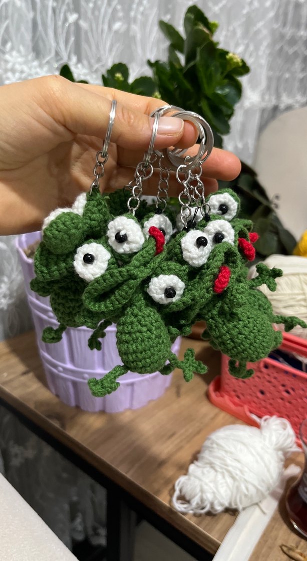 Renkli detaylara sahip örgü yeşil kurbağa anahtarlıklar, rahat ve bohem tarzlar için uygundur. Yumuşak iplikle el yapımıdır, rock punk ve retro görünümüne uygundur.
