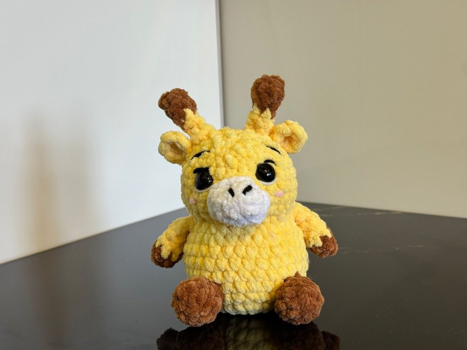 Yumuşak ve renkli sarı zürafa peluş oyuncak, kahverengi detaylar ve etkileyici gözlere sahip. Sarılmalık bir arkadaş.