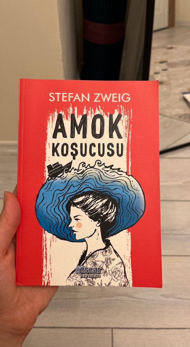 Stefan Zweig'in Amok Koşucusu adlı romanı, büyük mavi şapkalı bir kadının çizimiyle dikkat çeken kapağa sahip. Yoğun psikolojik temalar içerir.