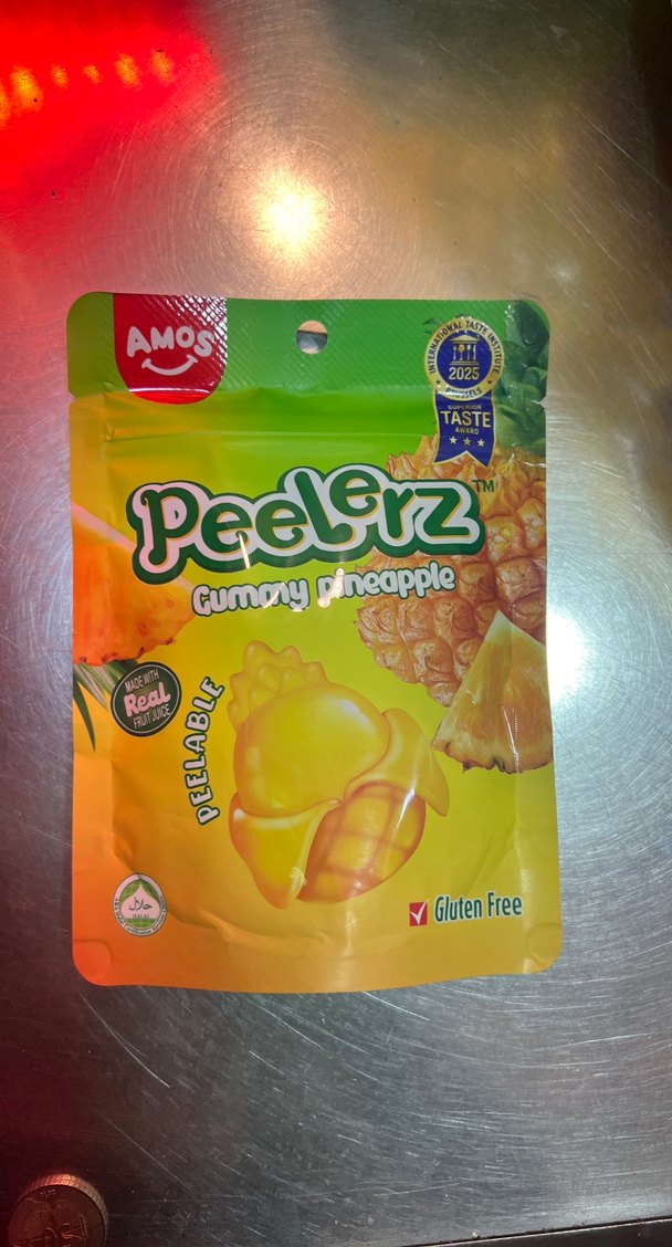 AMOS Peelerz ananas şekilli sakızlı şeker, gerçek meyve aromalı ve glutensizdir. Canlı sarı ambalajı eğlenceli tasarımıyla dikkat çeker.
