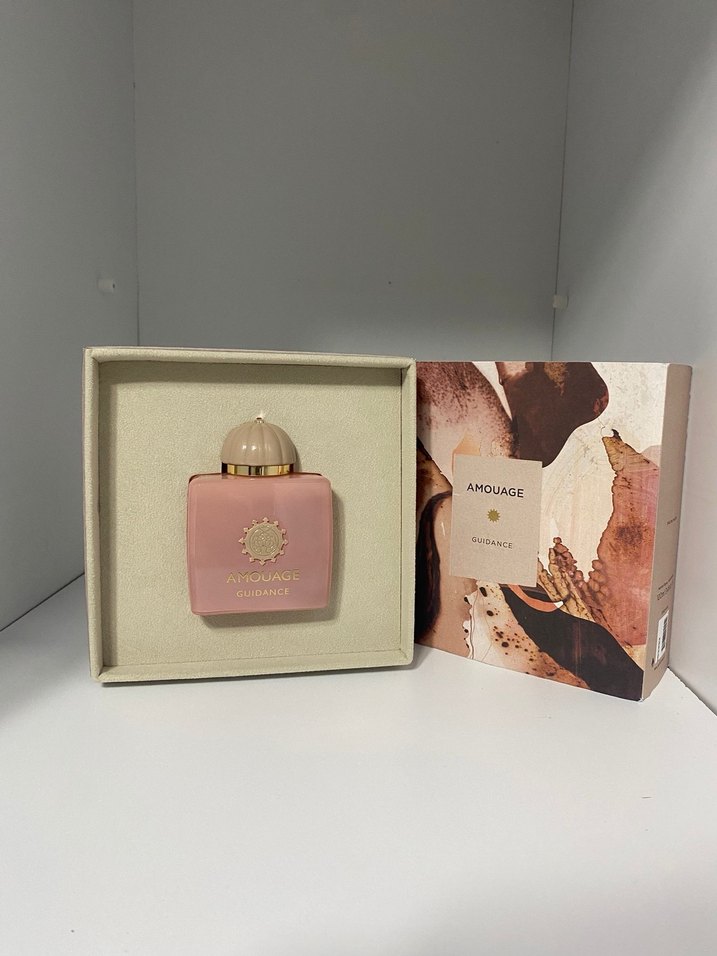 Amouage Guidance kadın parfümü, altın kapaklı pembe şişede ve sanat eseri tarzında çiçekli kutuda sunuluyor. Zarif ve şık bir kokuya sahip.