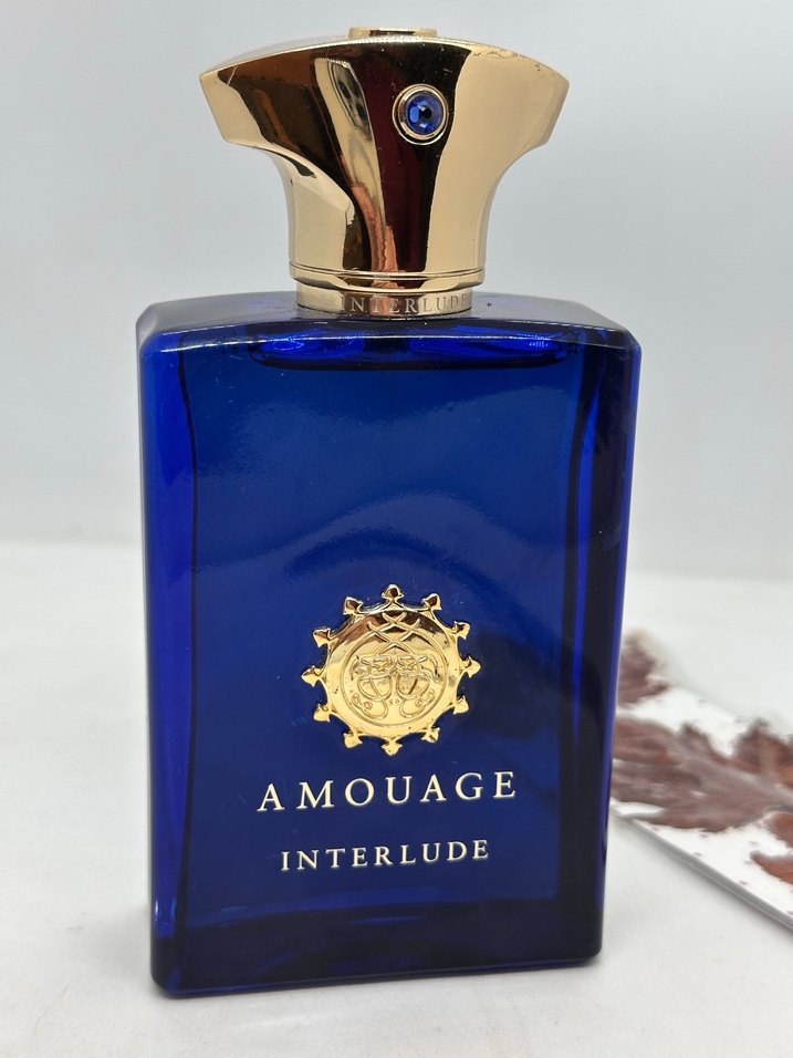 Amouage Interlude, parlak lacivert şişede, altın kapak ve amblemle klasik ve karşı kültür tarzında erkek parfümüdür.