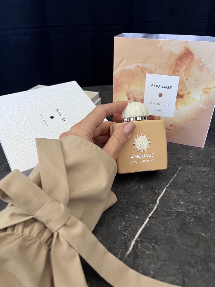 Amouage Love Delight kadın parfümü, şık bej tonlu şişesi ve uyumlu kutusuyla sıcak ve zarif bir koku sunar.