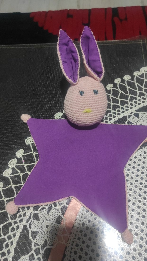 Yumuşak kumaştan mor, tavşan figürlü peluş oyuncak, örgü başlı ve sarılmak için uygun.