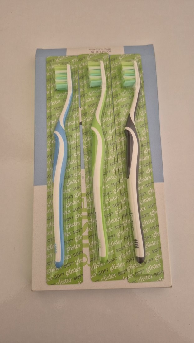 Mavi, yeşil ve siyah saplı, orta sertlik kıllara sahip üçlü diş fırçası seti. Nazik ve etkili temizlik sağlar.
