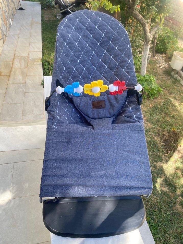 Koyu mavi kapitone kumaştan yapılmış, renkli çiçek oyuncakları takılı bebek ana kucağı mama marka oturma yerinde gözle gözükmeyecek küçük yanık var