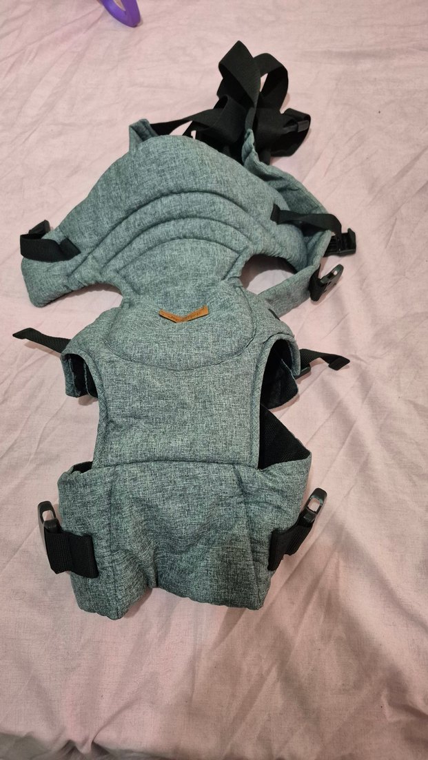 Gri renkli bebek taşıyıcı, ayarlanabilir kayışlar ve konforlu destek sunar. Bebeği güvenle taşımak için tasarlanmıştır.