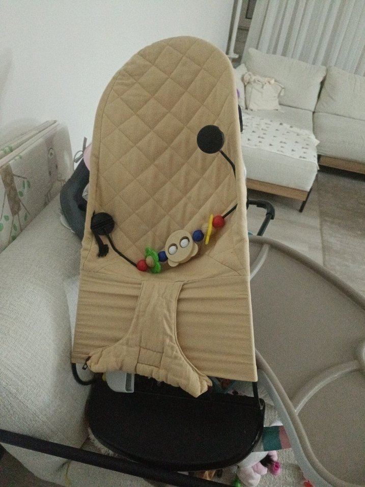 Camel renkli, yumuşak ve kapitone kumaştan yapılmış bebek taşıma askısı, renkli boncuklarla süslenmiş, bebeğiniz için rahat ve eğlenceli bir ürün.