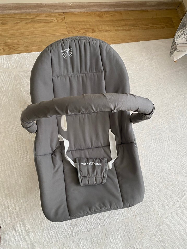 Gri renkte, emniyet kemerli ve yumuşak tutma saplı, kelebek detaylı bebek ana kucagı salanır makul teklıfe kabuldür