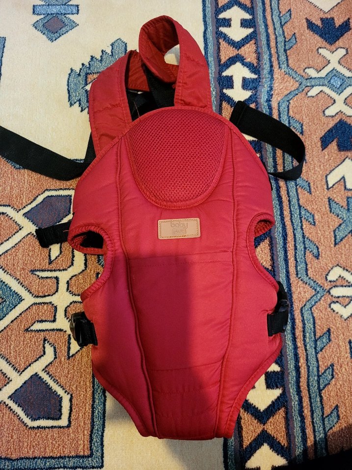 Ayarlanabilir kayışlara ve nefes alabilen kumaşa sahip kırmızı bebek taşıyıcı, konfor ve destek sağlar. Yastıklı omuz kayışlarıyla güvenli taşıma sunar.