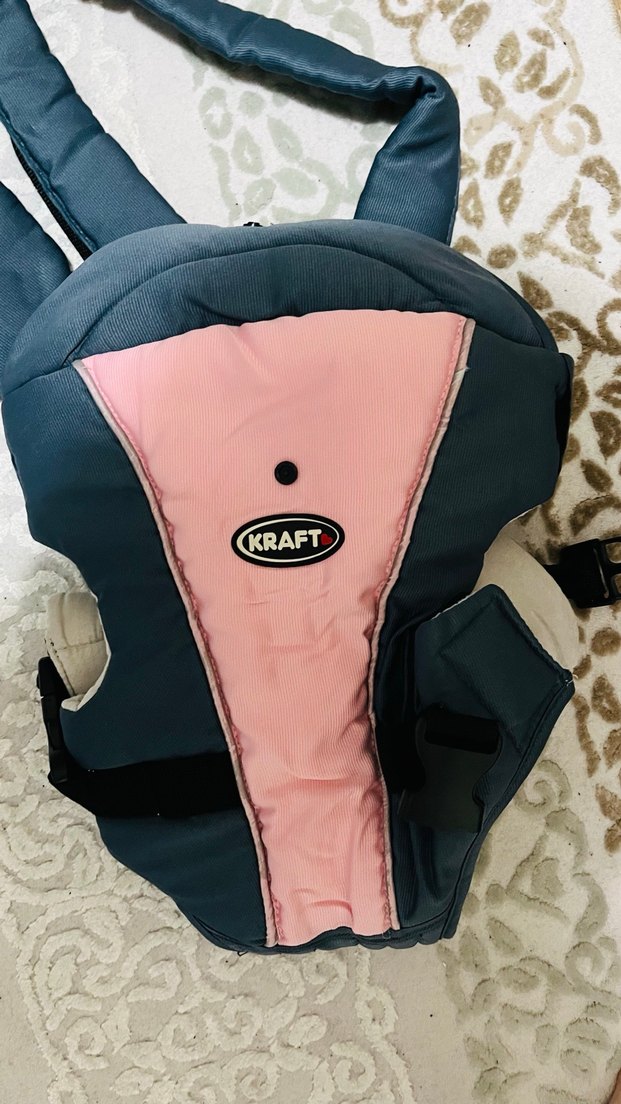Kraft bebek taşıyıcı, koyu ve pembe renk tonlarına sahip olup, rahat taşıma için sağlam askılar içerir. Önünde marka logosu bulunur.