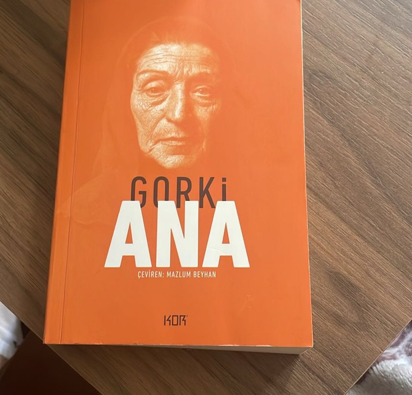 Maksim Gorki'nin 'Ana' romanı, Mazlum Beyhan çevirisiyle, yaşlı bir kadının yüzünün yer aldığı turuncu kapaklı etkileyici bir eser.