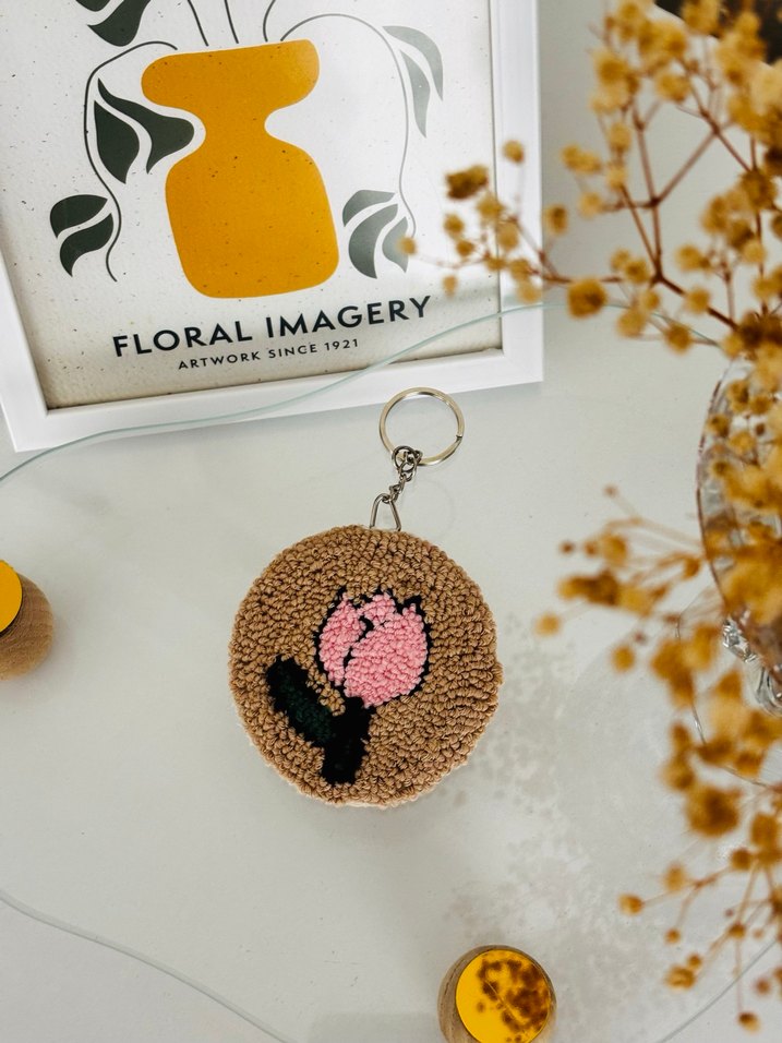 Boncuk işlemeli, bej renkli, renkli çiçek desenli yumuşak dokulu anahtarlık. Vintage esintili sanat çalışması motifi içerir.