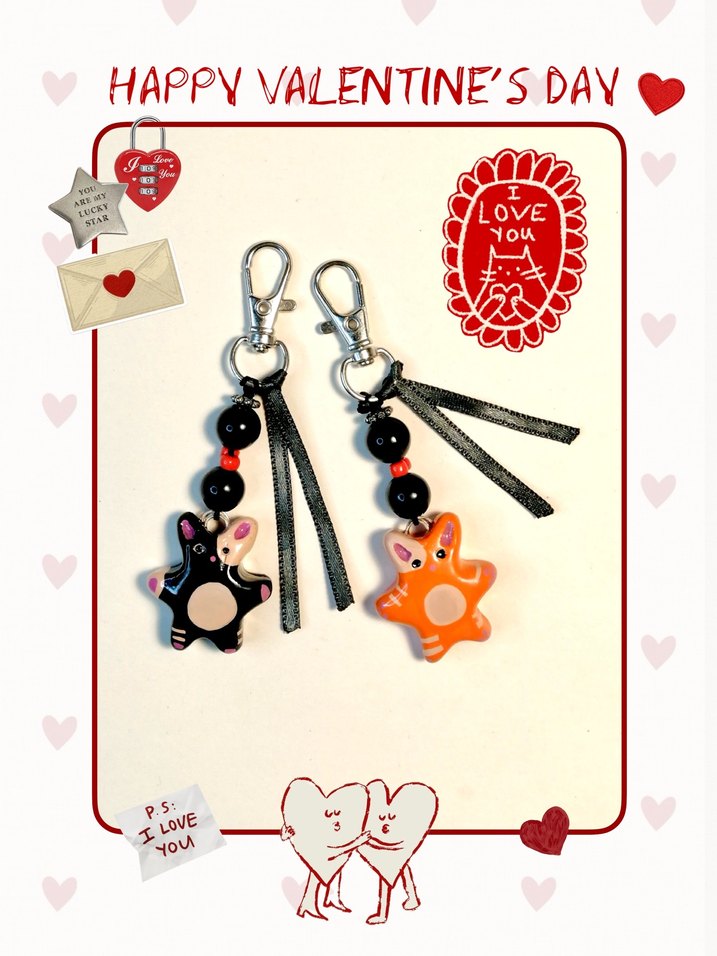 Renkli boncuklar ve siyah detaylarla rock punk tarzı, sevimli kedi figürlü anahtarlıklar. Sevgililer Günü mesajı içerir.