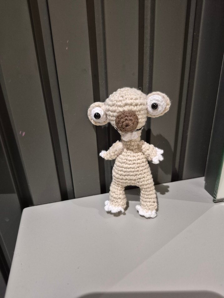 bej el yapımı amigurumi peluş oyuncak, büyük gözlere ve yumuşak örme dokuya sahiptir. Ellerinde ve ayaklarında beyaz detaylar bulunur.