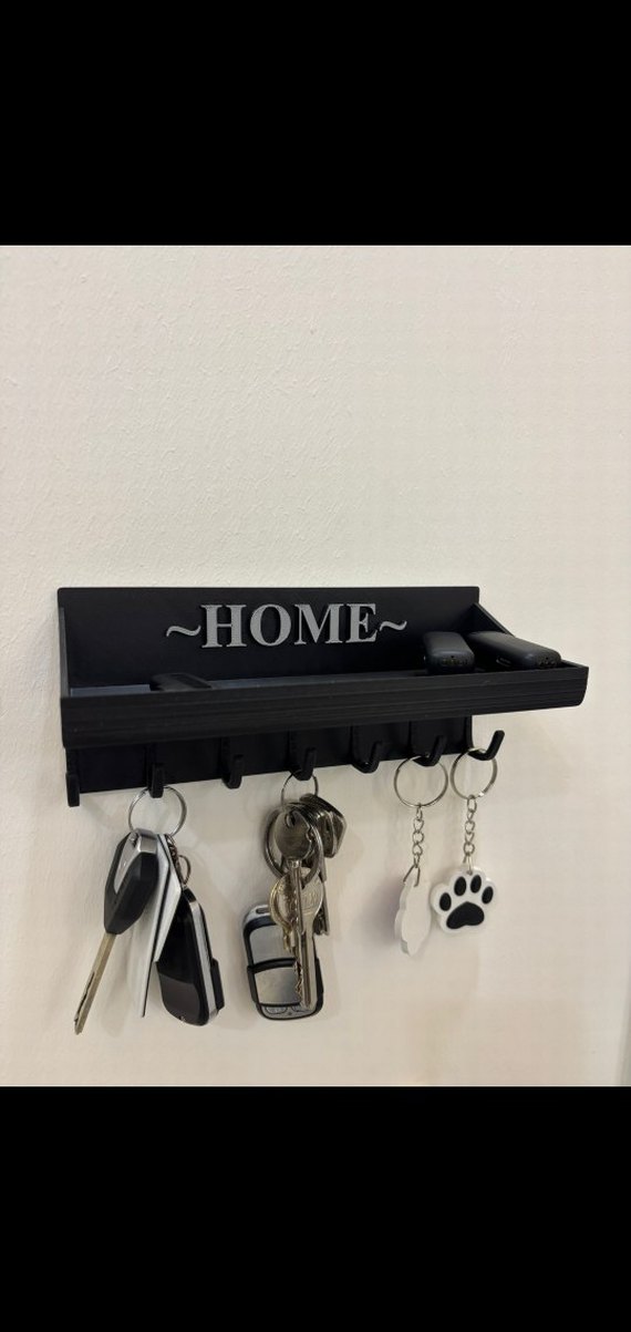 Duvara monte edilen siyah anahtarlık ve askılık rafı, beyaz "HOME" yazısıyla. Anahtarları ve küçük eşyaları düzenler. ️