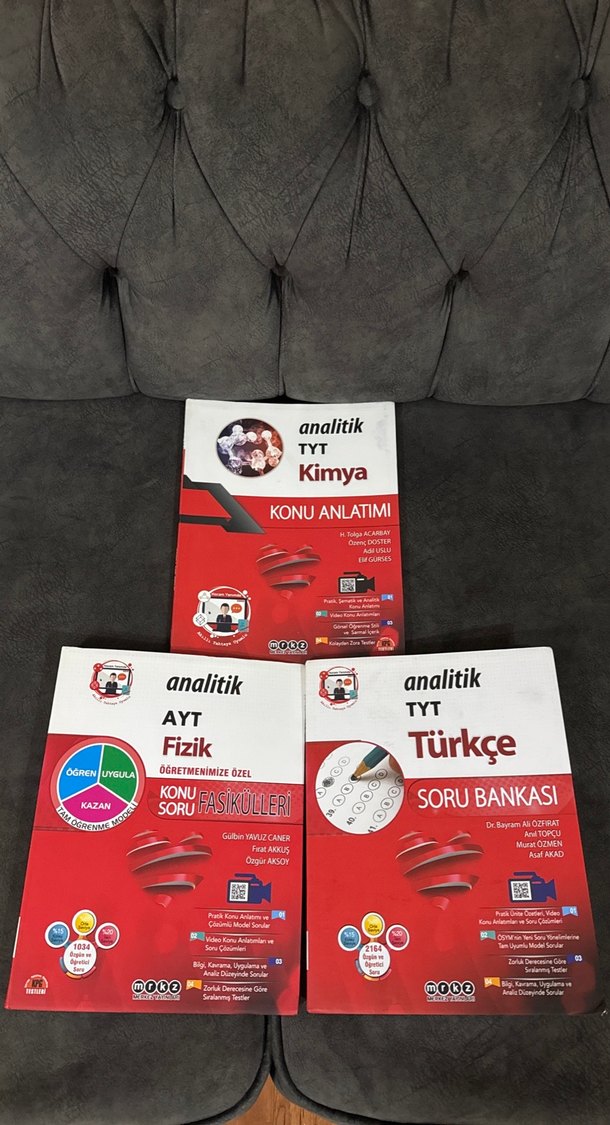 Analitik markasına ait TYT Kimya konu anlatımı, AYT Fizik soru fasikülleri ve TYT Türkçe soru bankası kitapları seti.