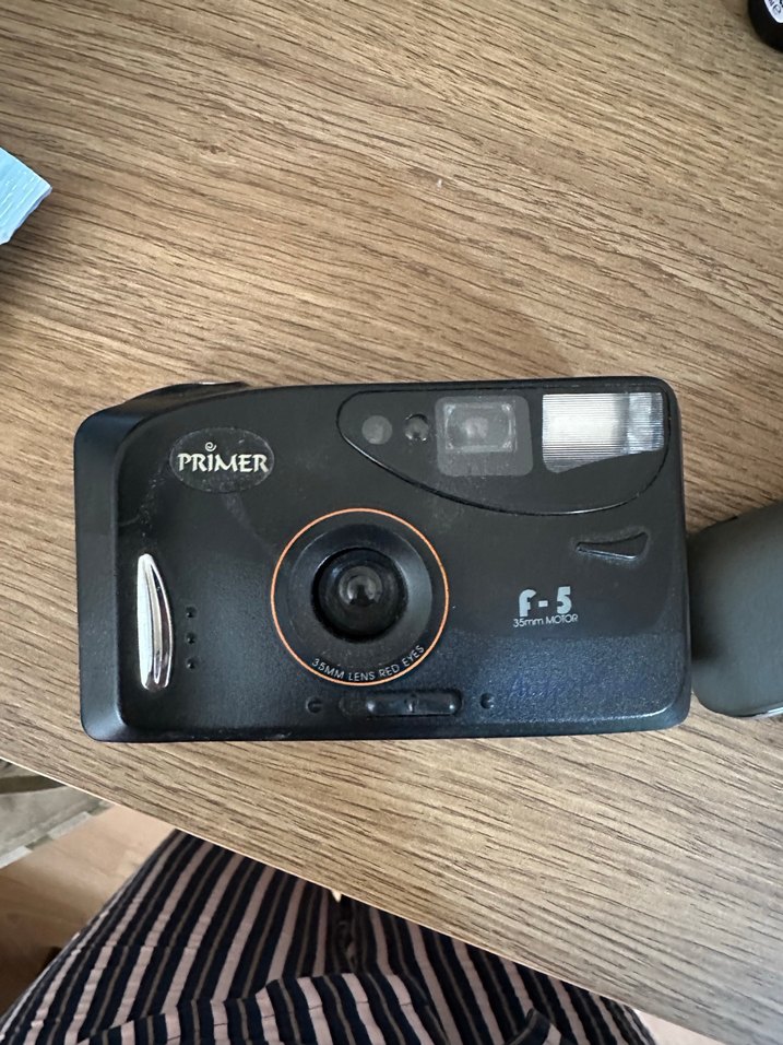 PRiMER F-5, dahili flaş ve 35mm lensli koyu bej renkli 35mm film kamerasıdır. çalışıyor sorunsuz