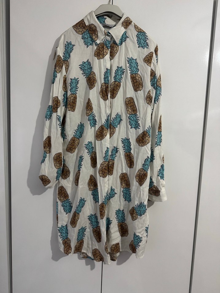Sentetik kumaştan yapılmış, ananas desenli, uzun kollu, bol kesim kadın gömlek. Yakalı ve düğmeli detaylara sahiptir.