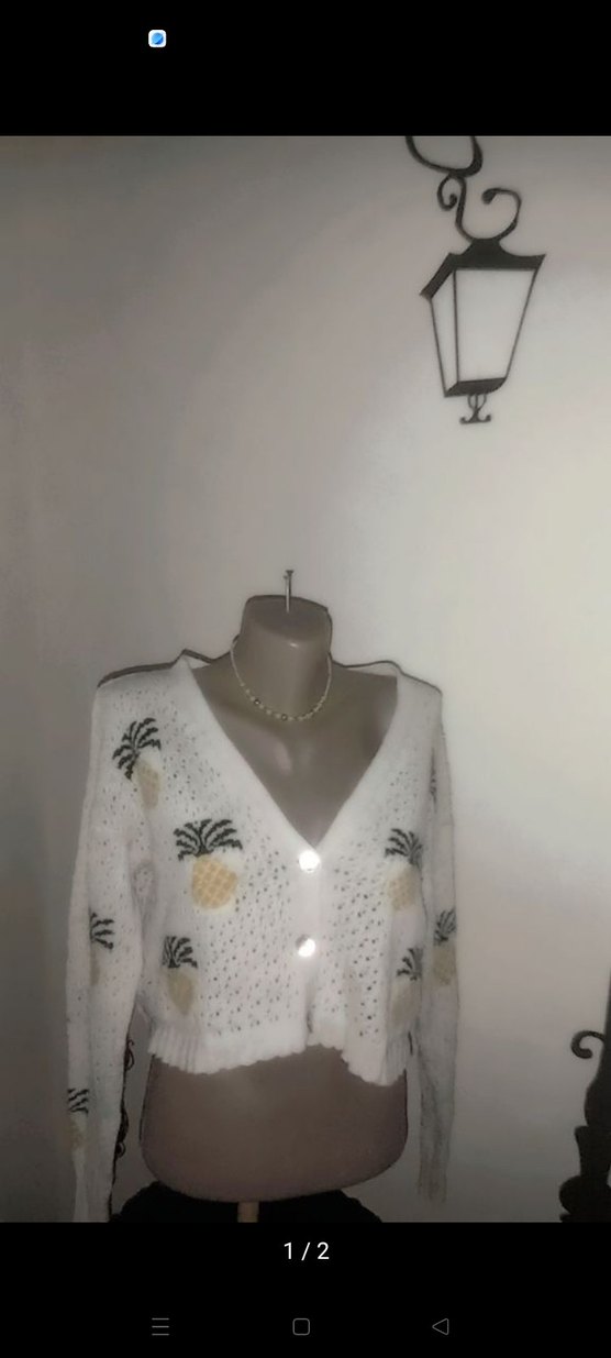 Ananas Detaylı V Yaka Düğmeli Beyaz Hırka