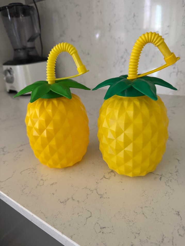 Parlak sarı gövde ve yeşil yapraklara sahip, ananas şeklinde renkli suluk, esnek sarı pipet içerir. İkili fiyattır.