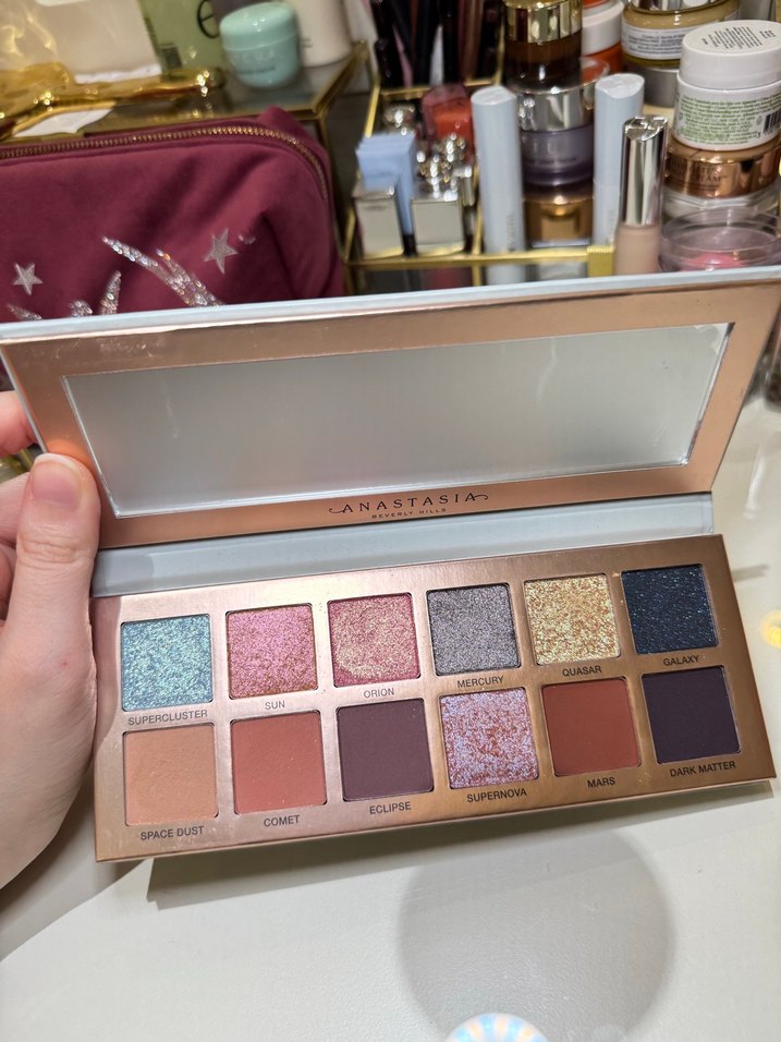 Anastasia Cosmos far paleti, canlı gri ve bej tonlarıyla çeşitli makyajlar sunar. Şık ve açık renkli kutuda, kabartmalı yazılar bulunur. Sadece bir kaç rengi çekimde kullanıldı sıfır sayılır
