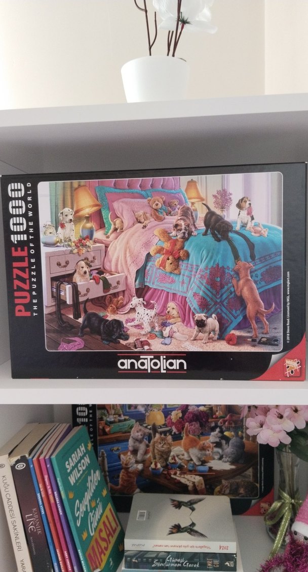 Anatolian markalı, 1000 parçadan oluşan, köpek temalı, canlı renklerde bir puzzle.