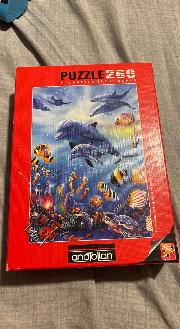 Anatolian marka 260 parçalı puzzle, yunuslar ve renkli balıklar içeren denizaltı temalı canlı bir görsel sunar.