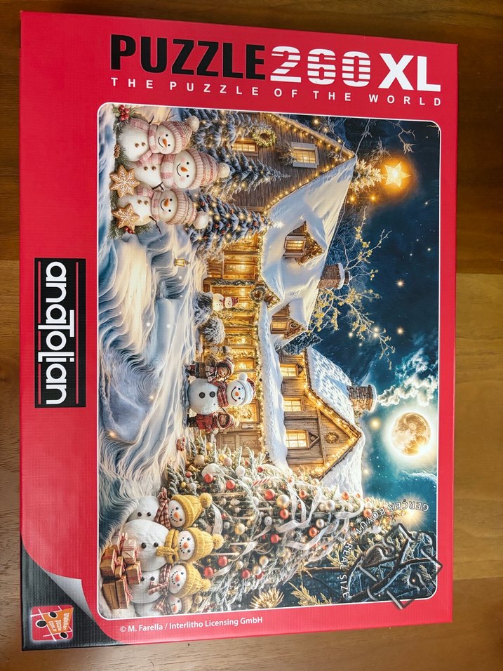 260 parçadan oluşan XL puzzle, karlar altında bir kulübe ve kardan adamları gösterir. Canlı altın ve açık tonlar, sıcak bir kış atmosferi sunar. ❄️