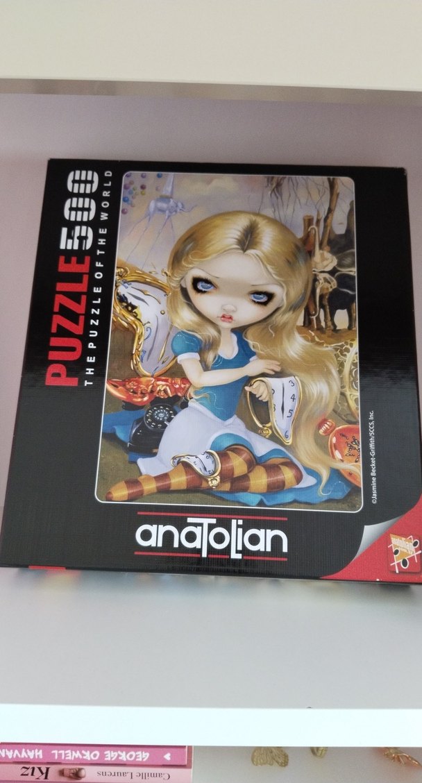 Anatolian marka, Alice temalı, koyu renkli ve canlı detaylara sahip puzzle. Bej tonlarında, sürreal ögelerle dikkat çekiyor.