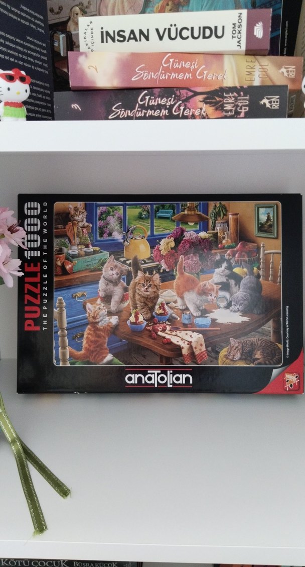 Anatolian markalı, kahverengi tonlarda, masa etrafında toplanmış oyuncu kedilerin yer aldığı puzzle.