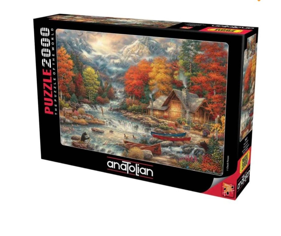 Anatolian markalı, nehir ve kabin içeren canlı sonbahar manzarası puzzle. Koyu ve çok renkli sahne, zorlayıcı ve görsel açıdan zengin bir deneyim sunar.