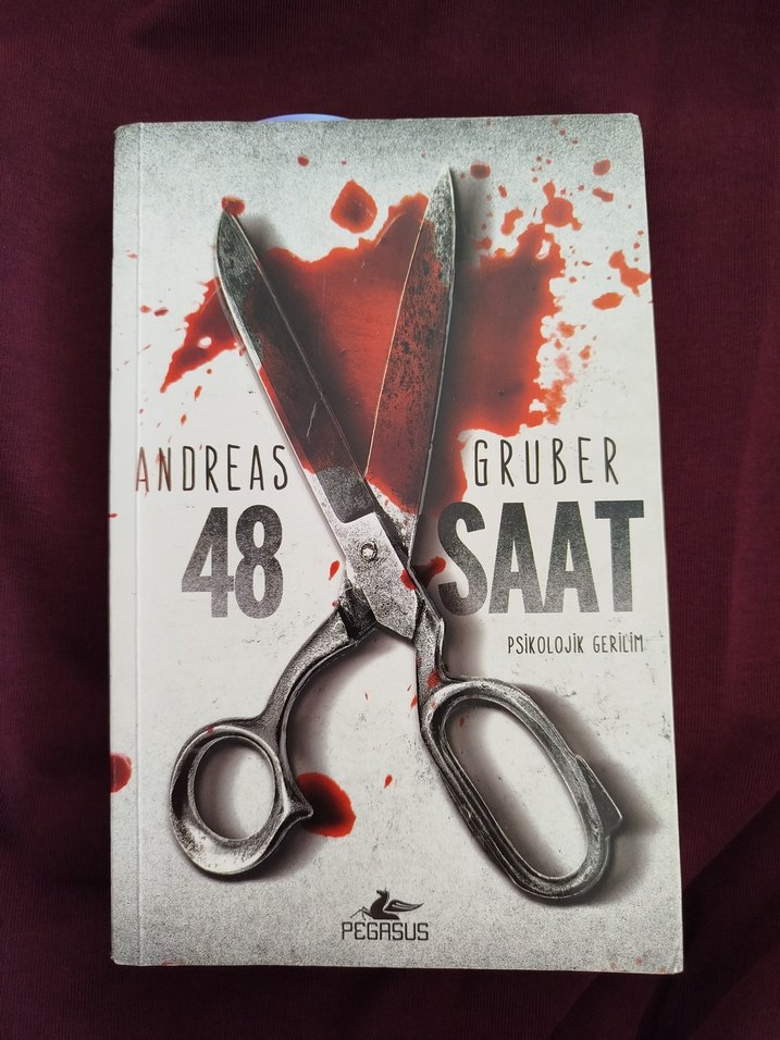 Andreas Gruber imzalı '48 Saat' kitabı, eski makas ve kan lekeleriyle psikolojik gerilim temasını yansıtıyor. defo belirtildi