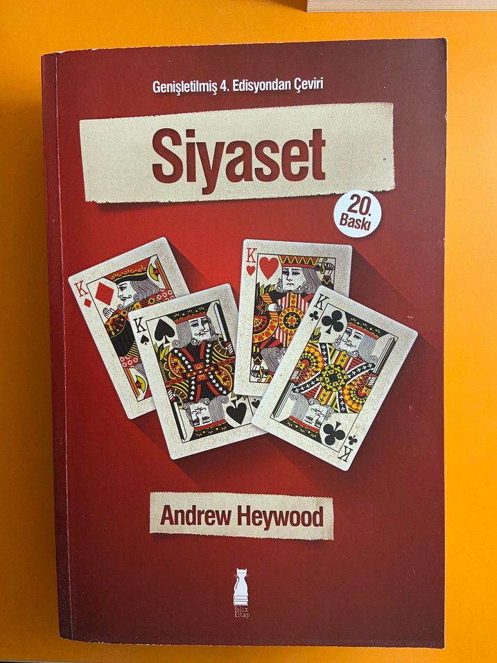 Andrew Heywood imzalı 'Siyaset' kitabı, siyaset bilimi konularını detaylıca ele alıyor. Kapağında oyun kartları ve koyu kırmızı arka plan bulunuyor.
