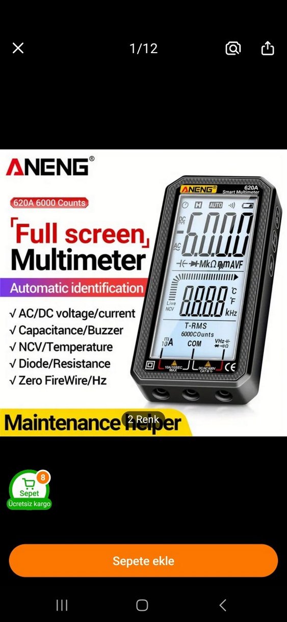 ANENG 620A dijital multimetre, tam ekran ve otomatik tanımlama özelliklerine sahiptir. AC/DC voltaj ve akım, kapasitans, sıcaklık, direnç ve frekans ölçümü yapar. Buzzer ve diyot testi özellikleri bulunur. 6000 sayım hassasiyetlidir ve bakım işleri için uygundur. ⚡
