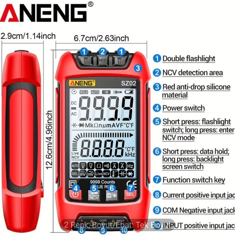ANENG SZ02 Akıllı Dijital Multimetre 9999 Sayım Gerçek RMS Otomatik Elektrik Kapasitans Ölçe Test Cihazları A. Genel Bakış: Ölçüm fonksiyonu ve aralığının otomatik seçimi Tam kapsamlı aşırı yük koruması Max. gösterim değeri: SZ01 6000 rakam/SZ02 9999 rakam Otomatik kapanma süresi: 15 dakika Örnekleme süresi: yaklaşık 3 kez/saniye Güç kaynağı: 2*1.5V AAA Pil (Dahil değil) SZ02: Ölçüm ucu ile toprak arasındaki maksimum gerilim 1000V DC veya 750V AC'dir Enstrüman bir yıl döngüsü olarak belirler ve 18°C~28°C altında yeniden kalibre edilir, bağıl nem %75'ten az olmalıdır.||| B.Özellik: Gerçek parametreler ürün ölçümüne tabidir.| Model SZ02 AC Akımı 999.9mA/10A DC Akımı 999.9mA/10A DC Gerilimi 600.0mV/9.999V/99.99V/ 999.9V AC Gerilimi 600.0mV/9.999V/99.99V/999.9V Hat açma-kapama Testi 10 Direnç 999.90/9.999kQ/99.99kQ/ 999.9kQ/9.999MQ/99.99MQ Diyot Testi 1V Kondansatör 9.999nF999.9nF/9.999uF/ 99.99uF/999.9uF/9.999mF/ 99.99mF NCV