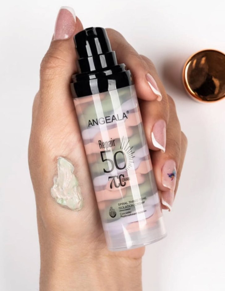 ANGEALA Onarıcı BB Krem, khaki tonunda ve SPF 50 korumasıyla cildi onarır ve korur, pastel renkli formüle sahiptir.
