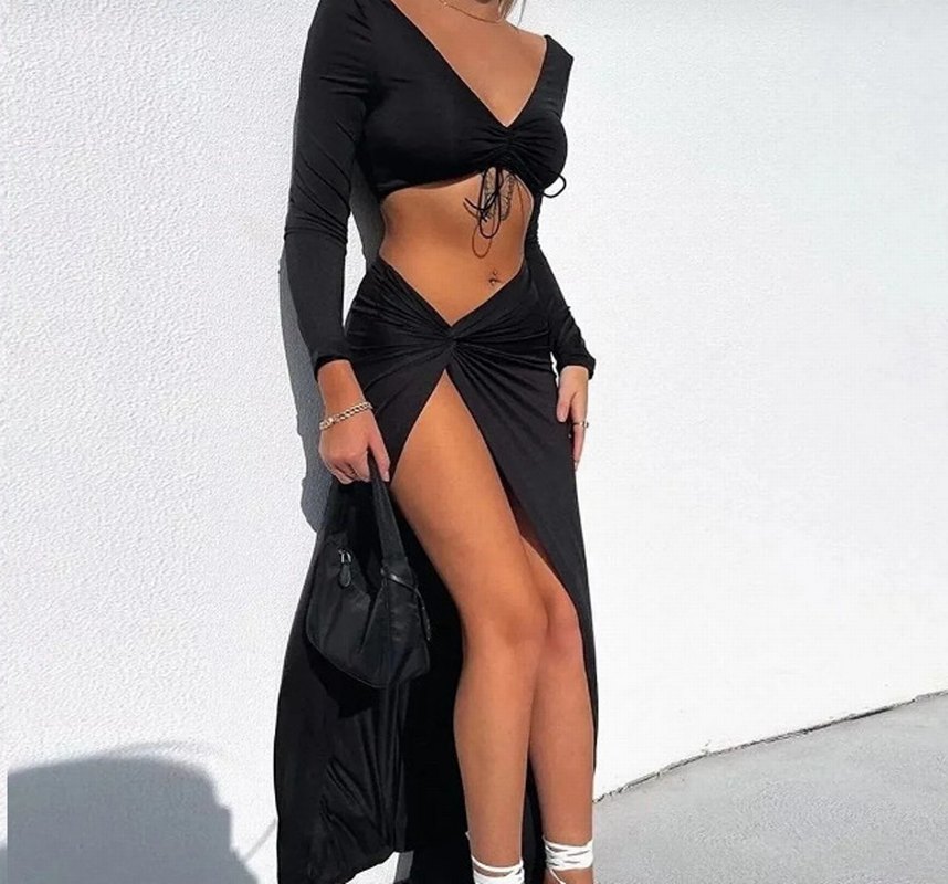 Siyah uzun, drapeli ve V yaka, askılı kollu, vücuda oturan kadın elbisesi, romantik ve gösterişli gece için uygundur.