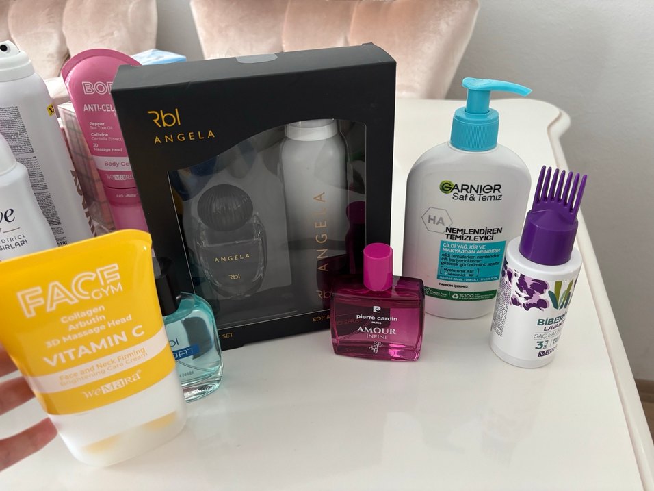 Angela Rbl parfüm ve Garnier nemlendirici temizleyici içeren set, koku ve cilt bakım ürünleri sunar.